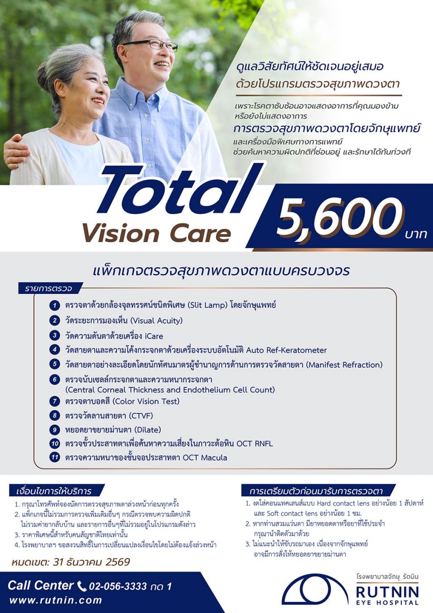 2. แพ็กเกจนี้ไม่รวมค่าใช้จ่าย กรณีที่จักษุแพทย์ตรวจพบสิ่งผิดปกติและต้องตรวจเพิ่มเติม นอกเหนือจากรายการในแพ็กเกจนี้